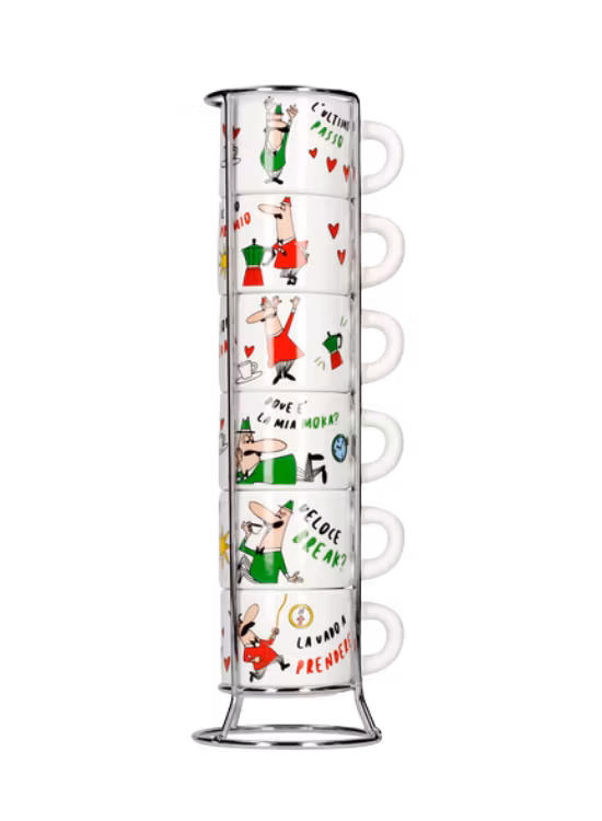 Bialetti stapelbare espressokopjes met rekje, 6 stuksHier heb je een set van 6 espressokopjes van Bialetti die je keuken echt opvrolijken Ð daar is geen twijfel over mogelijk! De koffiekopjes zijn gemaakt van stevig porselein dat je koffie langer warm houdt (belangrijk, dat weten we!). En ze hebben die kleurrijke Bialetti-look. Supermooi toch?Deze koffiekopjes zijn stapelbaar en worden geleverd met een handig rekje, zodat je geen chaos in de keuken hebt. Want we weten allemaal hoe lastig het soms kan zijn om alles netjes te houden. Elk kopje is precies goed voor een perfecte espresso of een lekkere kop mokakoffie uit je favoriete Bialetti mokkakan.Hou je van grotere kopjes? Geen probleem! Deze mooie kopjes zijn er ook als cappuccinokopjes Ð kijk maar eens hier!