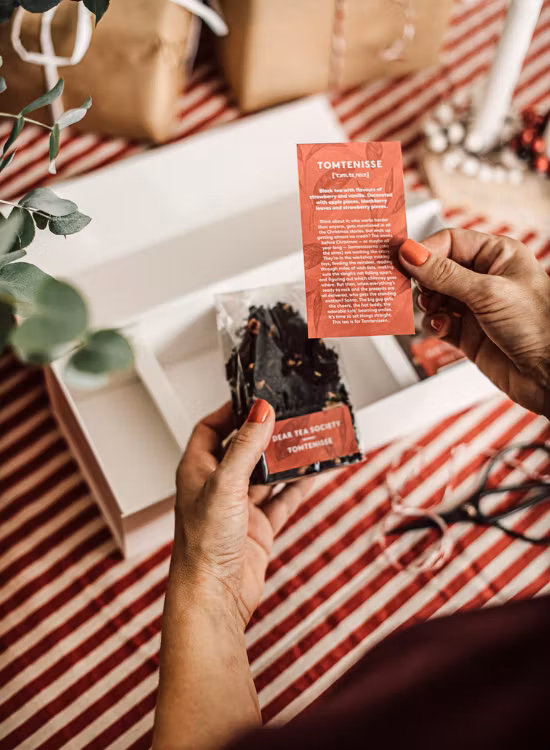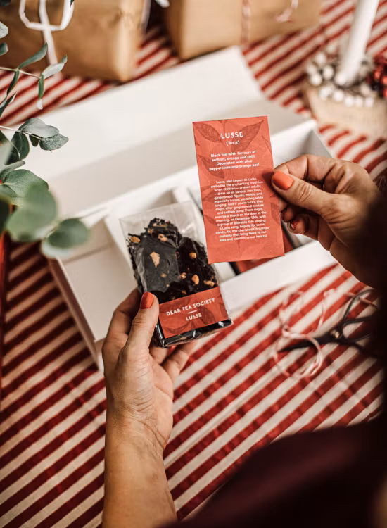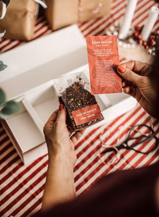Dear Tea Society Christmas SelectionKun je wel wat extra warmte gebruiken in de donkere wintermaanden? Dan is de Dear Tea Society Christmas Collection jouw beste vriend in december!Deze mooie collectie is perfect als thee-adventskalender als je elke advent een nieuw kerstthee wilt proeven, of als een luxe kerstbox om de hele maand van te genieten.In de box vind je vier magische smaken kerstthee, zorgvuldig geselecteerd om dat gezellige kerstgevoel te verspreiden:Glšgg Ð kruidig, verwarmend en precies zoals je favoriete kerstdrankje. Zwarte thee met smaken van kaneel, kardemom en kruidnagel. Afgewerkt met sinaasappelschil en kruidnagel.Lusse Ð gouden tonen van saffraan die je doen denken aan versgebakken lussebullar. Rooibos met smaken van kardemom, vanille en zwarte peper. Afgewerkt met kerstkruiden.Ršda Mulen Ð fruitig, fris en vol van kerstvreugde. Zwarte thee met smaken van saffraan, sinaasappel en chili. Afgewerkt met roze peperkorrels en sinaasappelschil.Tomtenisse Ð een spannende nieuwkomer vol met de beste kerstkruiden. Zwarte thee met smaken van aardbei en vanille. Afgewerkt met stukjes appel, bramenblad en aardbeistukjes.Elke thee zit in handige kleine zakjes (60 g per smaak).