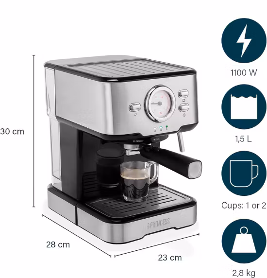 Espressomachine van Princess. Dit is een gebruiksvriendelijke en eenvoudige espressomachine, ideaal voor thuis of op plekken waar je maar een paar kopjes koffie per dag drinkt. De machine heeft een krachtige pomp die tot 20 bar gaat en kan twee espressoÕs tegelijk zetten. Je kunt hem ook instellen voor verschillende koffiedranken met melkschuim, zoals cappuccino, latte macchiato en caffe latte.