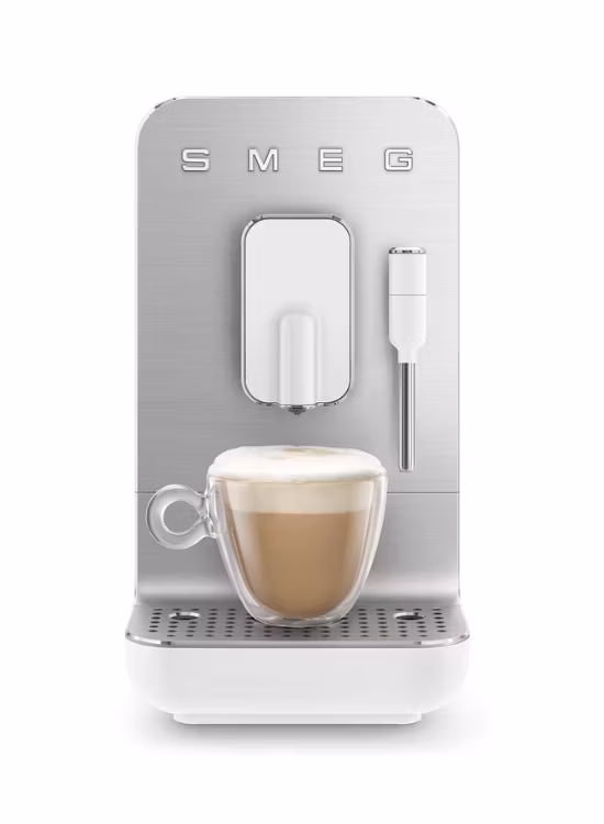 volautomatische espressomachine met melkopschuimer in het wit.Een geŸpgradede versie van de Smeg BCC01 geeft je een volautomatische koffiemachine met stoompijpje, zodat je thuis eenvoudig melkdranken zoals latte en cappuccino kunt maken.De volautomatische koffiemachine Smeg BCC02 is een fantastisch veelzijdige, stijlvolle en compacte espressomachine die jouw koffiemomenten echt bijzonder maakt.De automatische koffiemachine van Smeg is uitgerust met geavanceerde technologie, zodat je je koffie helemaal naar wens kunt zetten. Met het intu•tieve bedieningspaneel kies je uit verschillende zetstanden, pas je de maalgraad en de sterkte van je koffie aan. Je kunt zelfs ŽŽn of twee kopjes tegelijk zetten Ð ideaal als je vrienden of familie wilt trakteren op een heerlijke kop koffie!De espressomachine heeft een thermoblock-verwarmingssysteem voor snelle opwarming en nauwkeurige temperatuurregeling van het water, zodat je altijd de beste koffiesmaak krijgt.Met de ingebouwde melkopschuimer maak je moeiteloos zacht en romig melkschuim voor je favoriete melkdranken. De melkopschuimer is makkelijk te gebruiken en schoon te maken, zodat je zonder gedoe kunt genieten van perfect opgeschuimde melk. De koffiemachine heeft ook een ingebouwde koffiemolen, zodat je altijd de ultieme smaak uit verse koffiebonen haalt.De volautomatische koffiemachine van Smeg is uniek door de combinatie van stijl en functionaliteit. Je zet je koffie precies zoals jij het wilt en geeft je keuken meteen een elegante uitstraling. Geniet thuis van de kunst en het vakmanschap van koffiezetten met de automatische espressomachine van Smeg.Details over de Smeg volautomatische koffiemachine met stoompijpje:19 bar1,4L watertankBonenreservoir: 150 gThermoblockIngebouwde metalen molen met 5 standenUitneembare zetgroep3 koffiesterktes, 6 verschillende koffiedrankenMakkelijk schoon te makenAutomatische uitschakeling na 20 minGewicht: 5 kgAfmetingen: breedte 18 cm, hoogte 33,6 cm, diepte 43,3 cmSnoerlengte: 100 cmVermogen: 1350 W